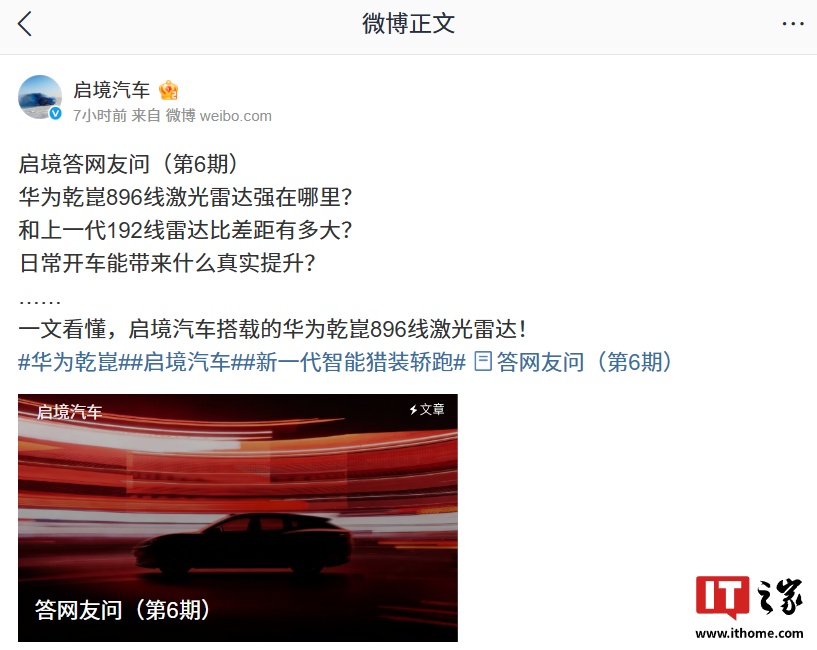 3月6日,華為乾崑|啟境汽車官方發(fā)布了對(duì)網(wǎng)友關(guān)于其896線激光雷達(dá)的疑問解答。華為乾崑896線激光雷達(dá)以其全球量產(chǎn)最高線數(shù)和雙光路架構(gòu),實(shí)現(xiàn)了從“點(diǎn)云級(jí)”到“圖像級(jí)”的感知躍遷,顯著提升了駕駛輔助系統(tǒng)的識(shí)別精度、遠(yuǎn)距能力和復(fù)雜場(chǎng)景表現(xiàn)。該雷達(dá)的點(diǎn)云密度是192線雷達(dá)的4倍,單幀點(diǎn)云量約為128線的7倍,達(dá)到“4K級(jí)”空間分辨率,能清晰勾勒目標(biāo)輪廓。在小目標(biāo)精準(zhǔn)識(shí)別方面,120米外能穩(wěn)定識(shí)別14厘米高的碎石、錐桶、倒地