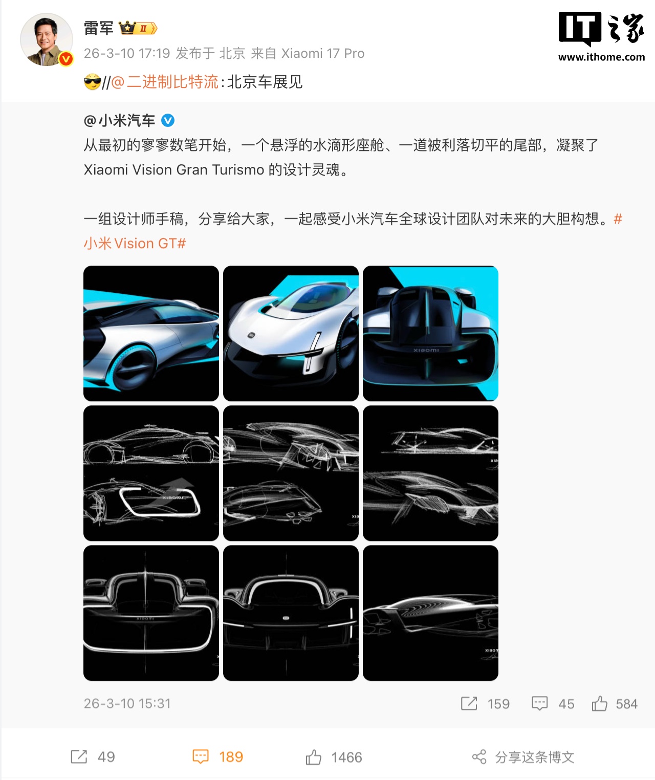 3月11日,小米董事長雷軍在微博上分享了小米VisionGranTurismo雙門超跑設(shè)計(jì)師手稿,并暗示即將在