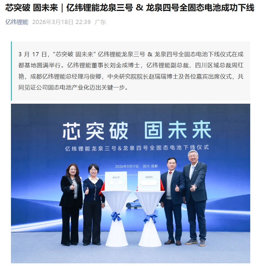 3月17日,億緯鋰能在成都基地舉行了龍泉三號(hào)&龍泉四號(hào)全固態(tài)