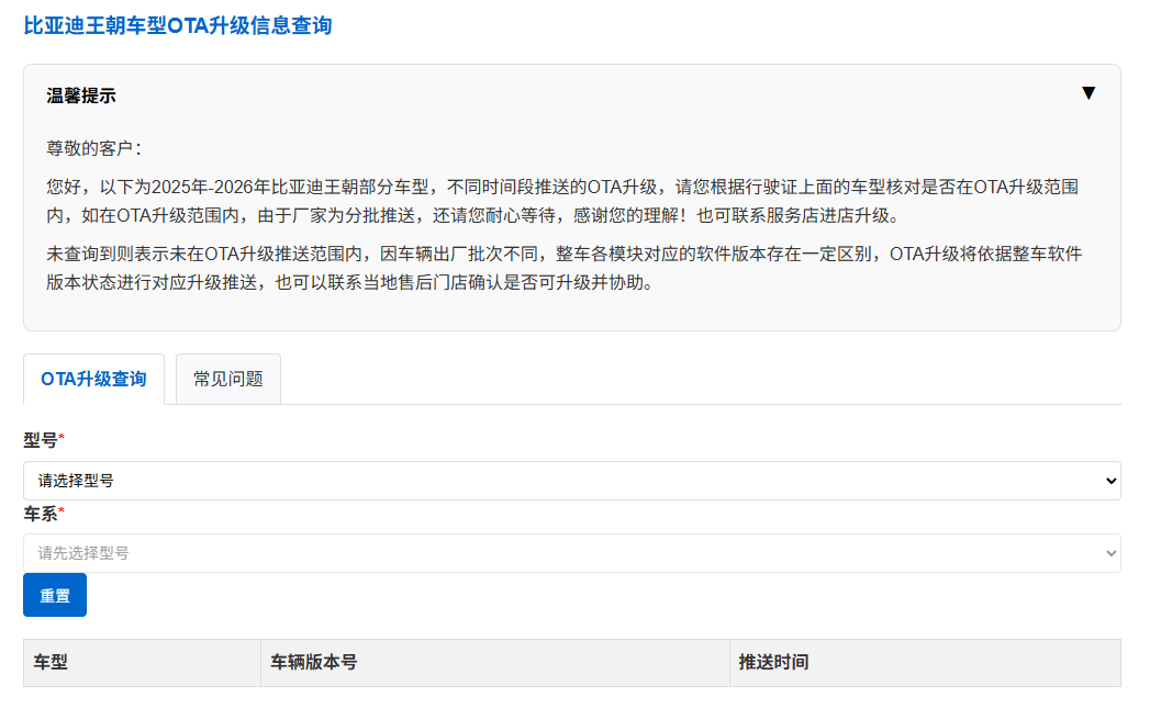 近日,比亞迪官方渠道上線了王朝網(wǎng)與海洋網(wǎng)車(chē)型的OTA升級(jí)信息查詢?nèi)肟?,服?wù)對(duì)象為2025年至2026年部分車(chē)型的車(chē)主。車(chē)主可通過(guò)輸入車(chē)型信息,查詢到具體的升級(jí)車(chē)型、升級(jí)版本號(hào)以及推送起止時(shí)間。這一查詢?nèi)肟诘脑O(shè)立,旨在幫助車(chē)主更清晰地掌握車(chē)輛的OTA升級(jí)安排,減少信息搜集的不便。