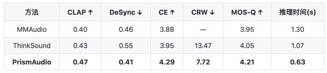 在性能測試中,PrismAudio在VGGSound測試集上超越了現(xiàn)有最佳方法,并在AudioCanvas測試集上表現(xiàn)更加出色。該模型參數(shù)僅有5.18億,生成9秒音頻僅需0.63秒,顯示出其輕量級和實(shí)用性。PrismAudio的研究已被ICLR2026收錄,代碼即將開源。